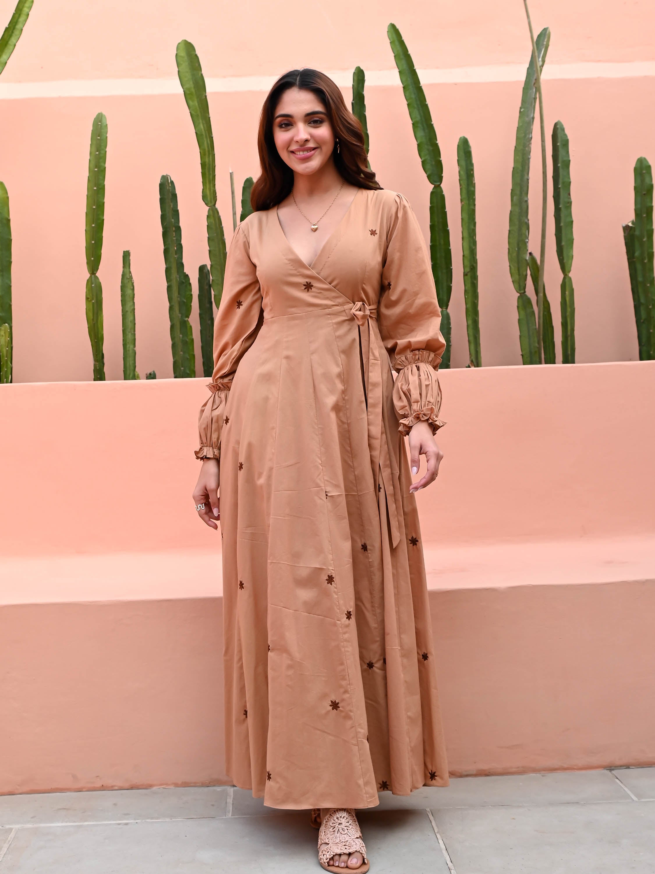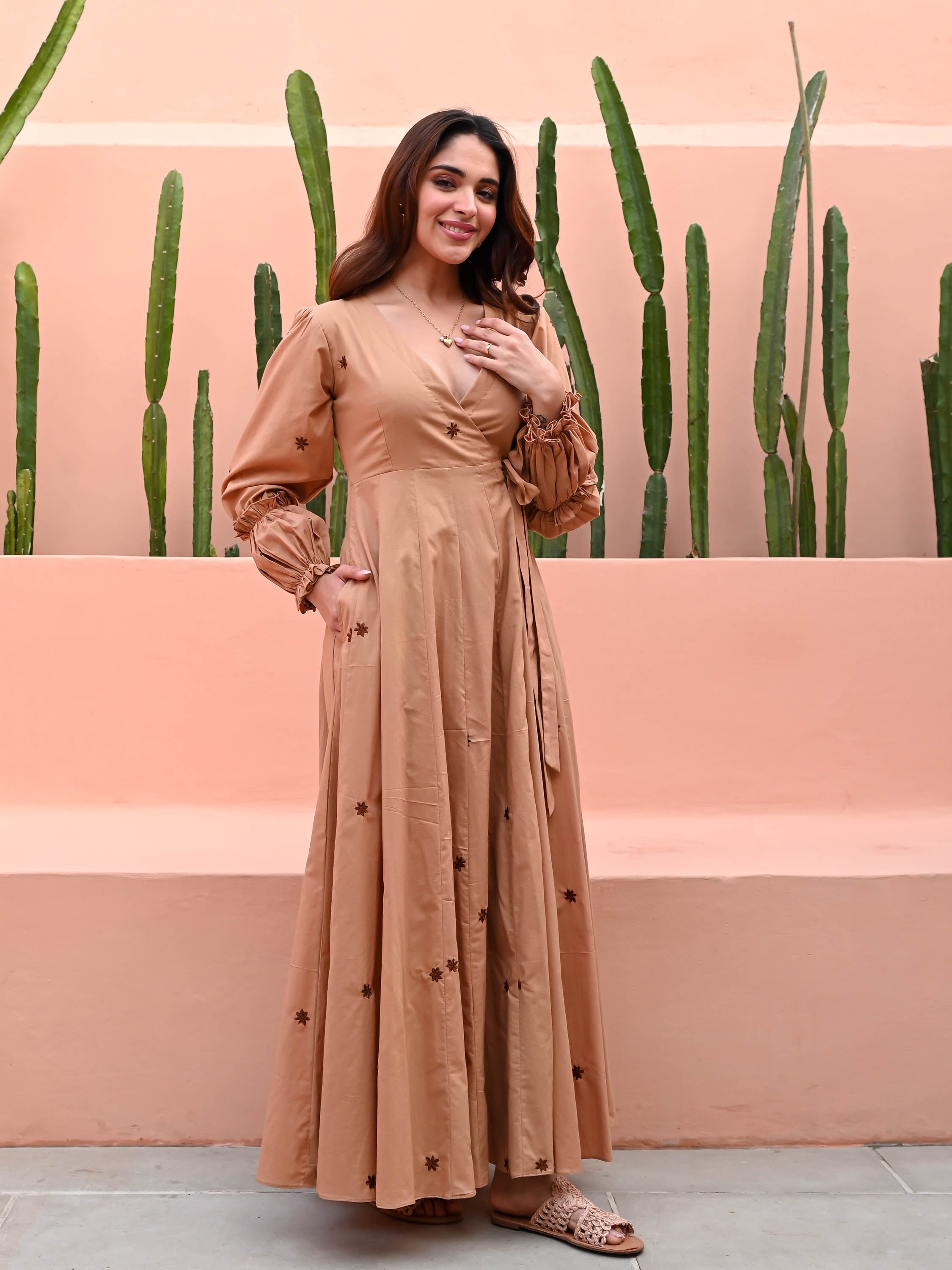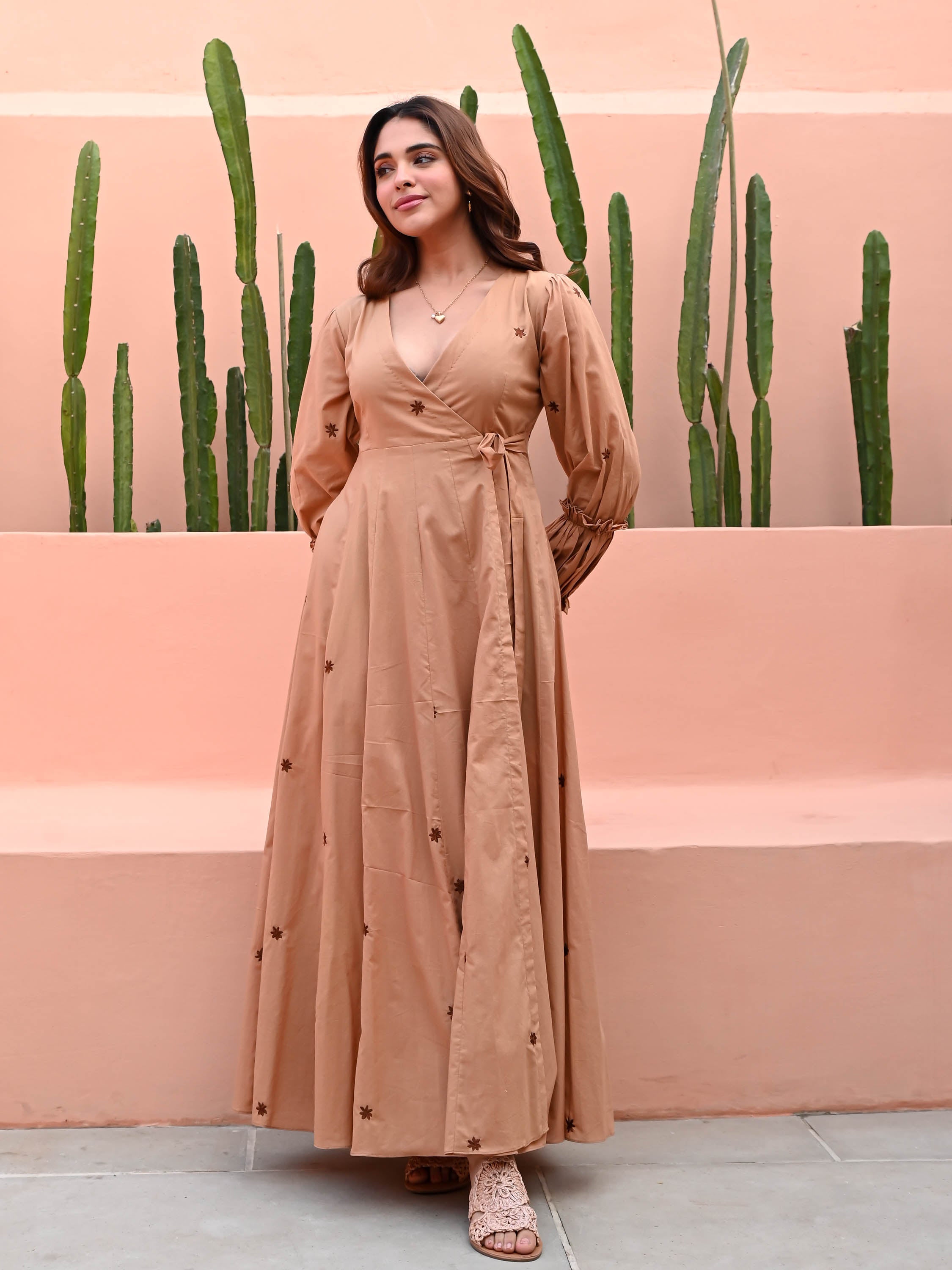 Embrace understated elegance with our Sandstone Cotton Dress, crafted from soft beige cotton. Adorned with delicate brown floral embroidery, it features a flattering V-neckline and full puffed sleeves for a touch of vintage charm. The full flared skirt adds graceful movement, making it perfect for both casual and dressy occasions. A timeless piece for effortless style.
