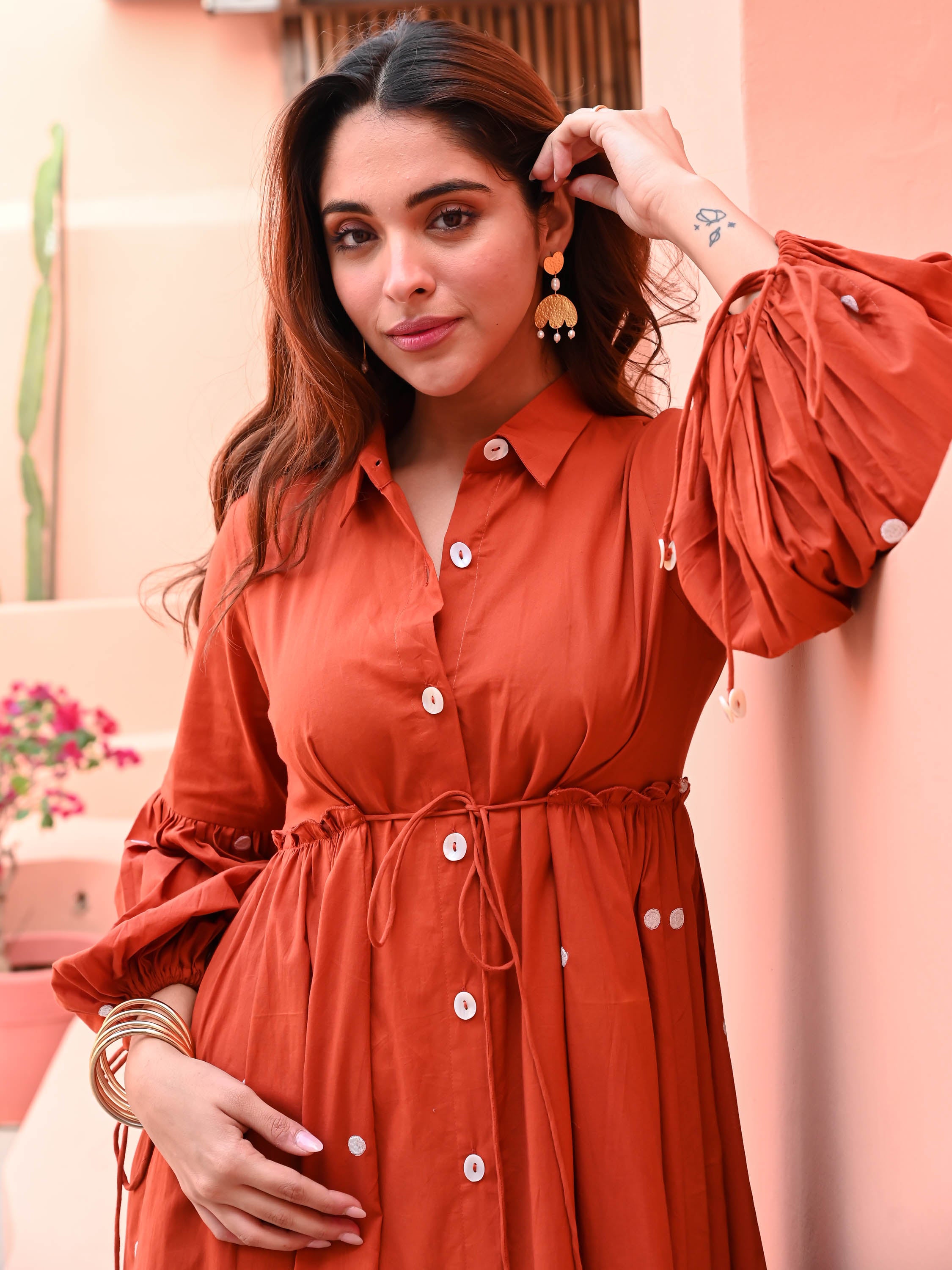 Bold and effortlessly chic, the Spicy Orange Cotton Dress is a statement in rust-orange cotton. This midi shirt dress features intricate placement embroidery throughout, adding artisanal charm. A cinched waist enhances the silhouette, while full puffed sleeves and a button-down front placket complete the look. Perfect for days when style and comfort go hand in hand.