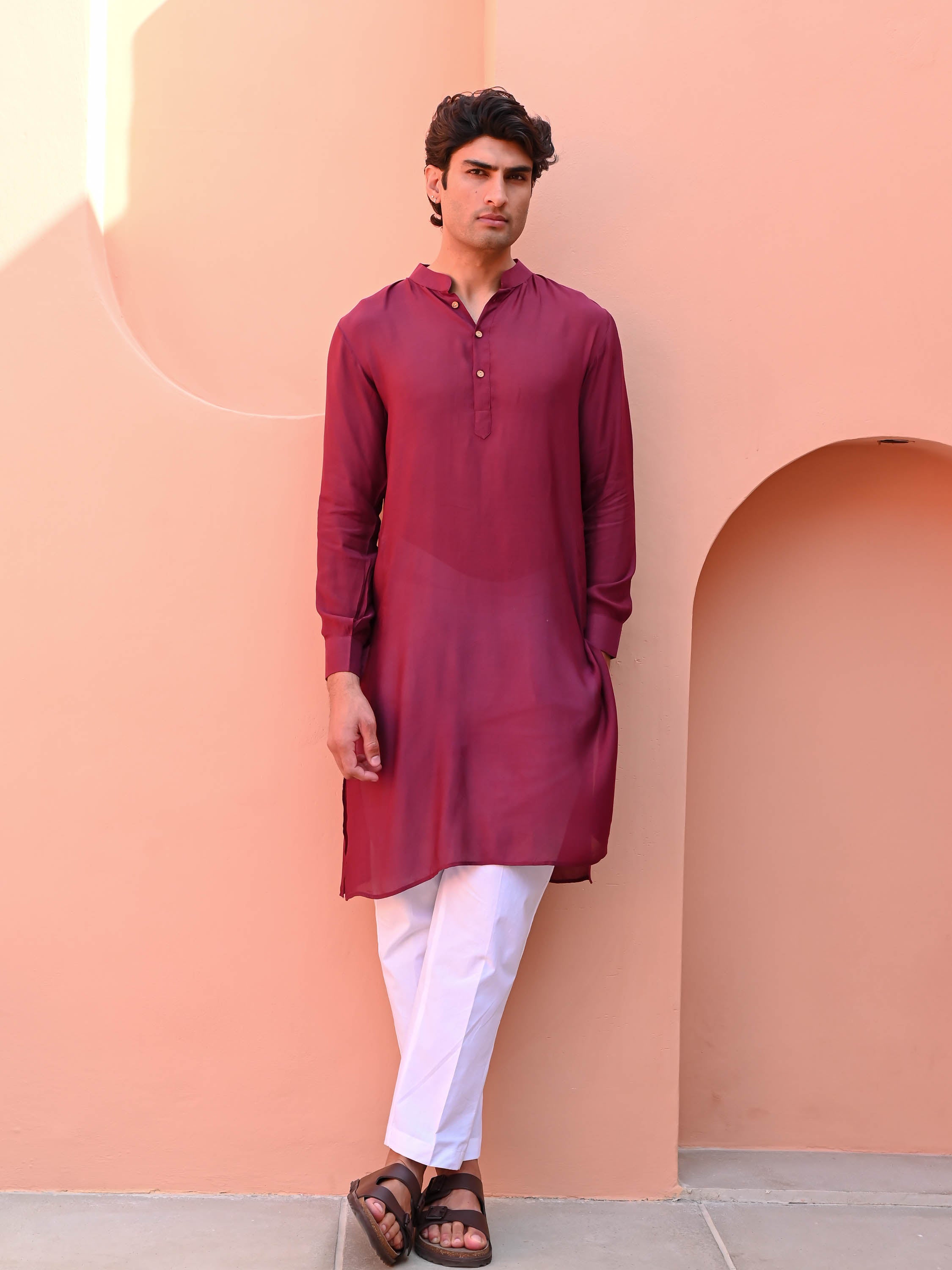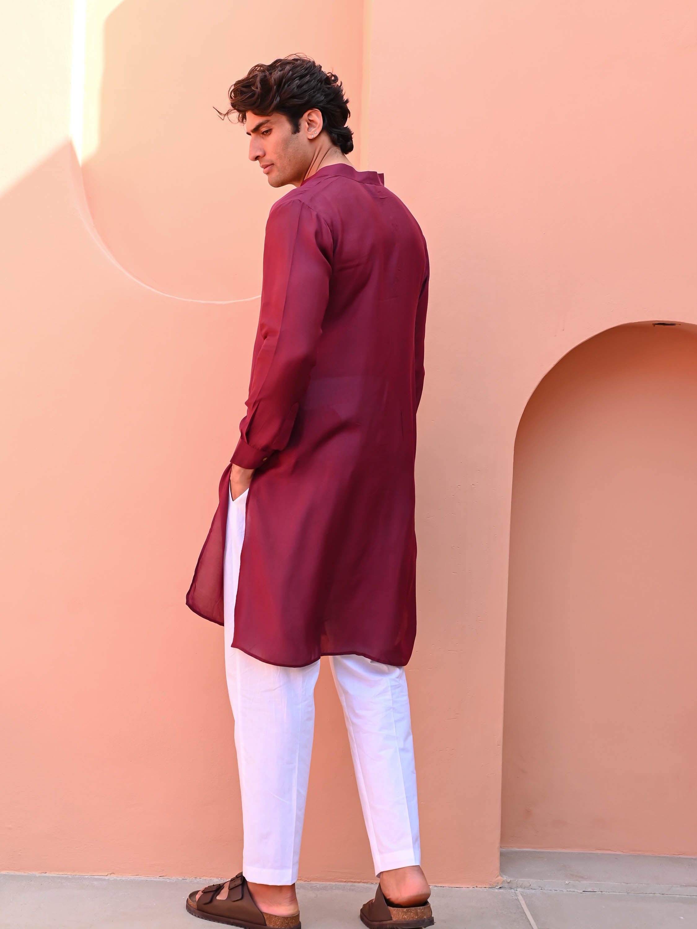 Elevate your style with the Wine Color Men Long Kurta, crafted from luxurious cotton silk fabric for a smooth, refined finish. Featuring a sleek Mandarin collar, a button-front placket, and full sleeves with cuffs, this kurta combines tradition with contemporary elegance. Complete with two side pockets, it’s perfect for both casual and festive occasions.