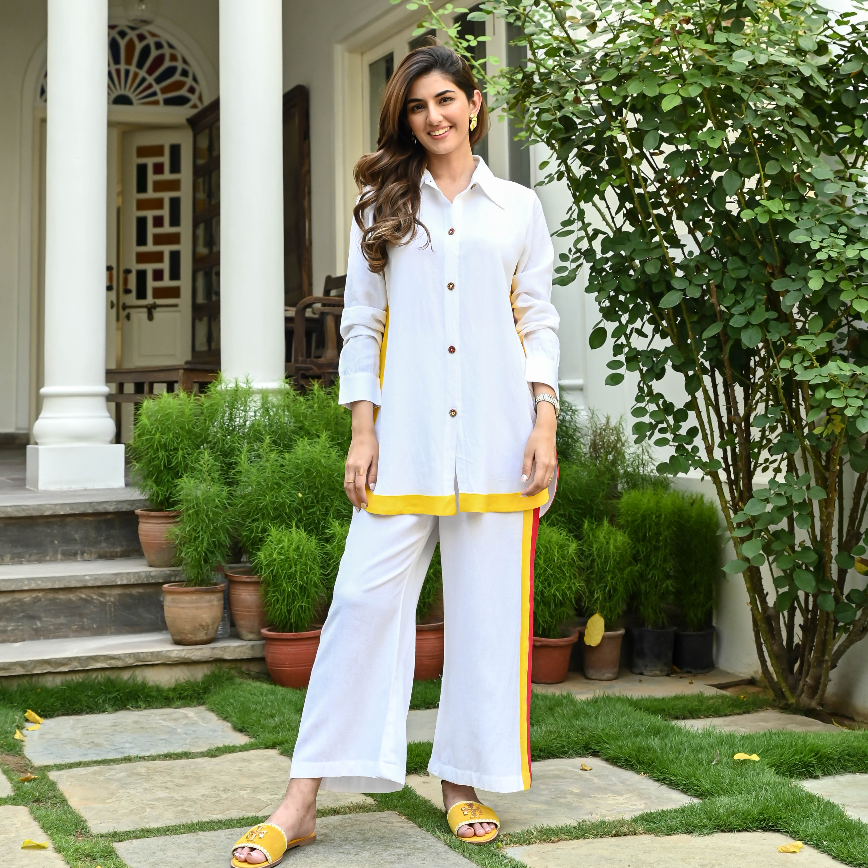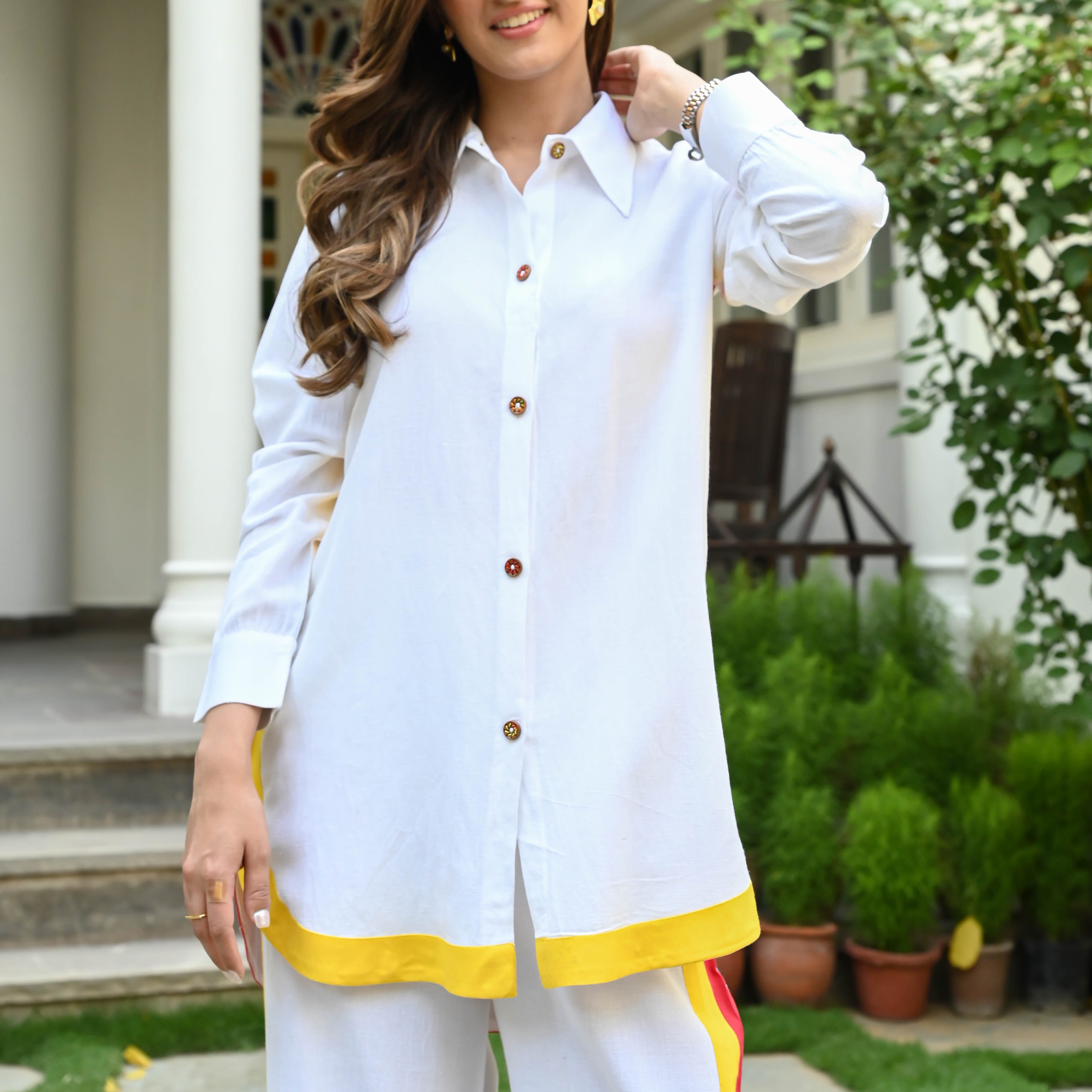 Get ready to turn heads with our Cotton Tri-Colour Co-ord Set! This playful ensemble features a crisp white shirt and pants, jazzed up with bursts of vibrant yellow and daring red. It's the perfect blend of timeless elegance and energetic flair. Slip into comfort with breathable cotton fabric that keeps you cool, while the impeccable tailoring ensures a flattering fit.