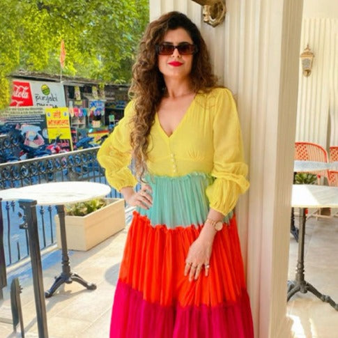 Embrace the beauty of a sunset with our Meadow Dream Cotton Dress! Its vibrant color-blocked hues of yellow, blue, orange, and crimson paint a picturesque sky. The empire waist, deep V-neckline, and delicate pearl loop buttons exude elegance, while the dramatic bubble sleeves add a touch of allure. Perfect for romantic evenings or garden parties, this dress transforms any moment into a dreamy escape into nature's splendor.