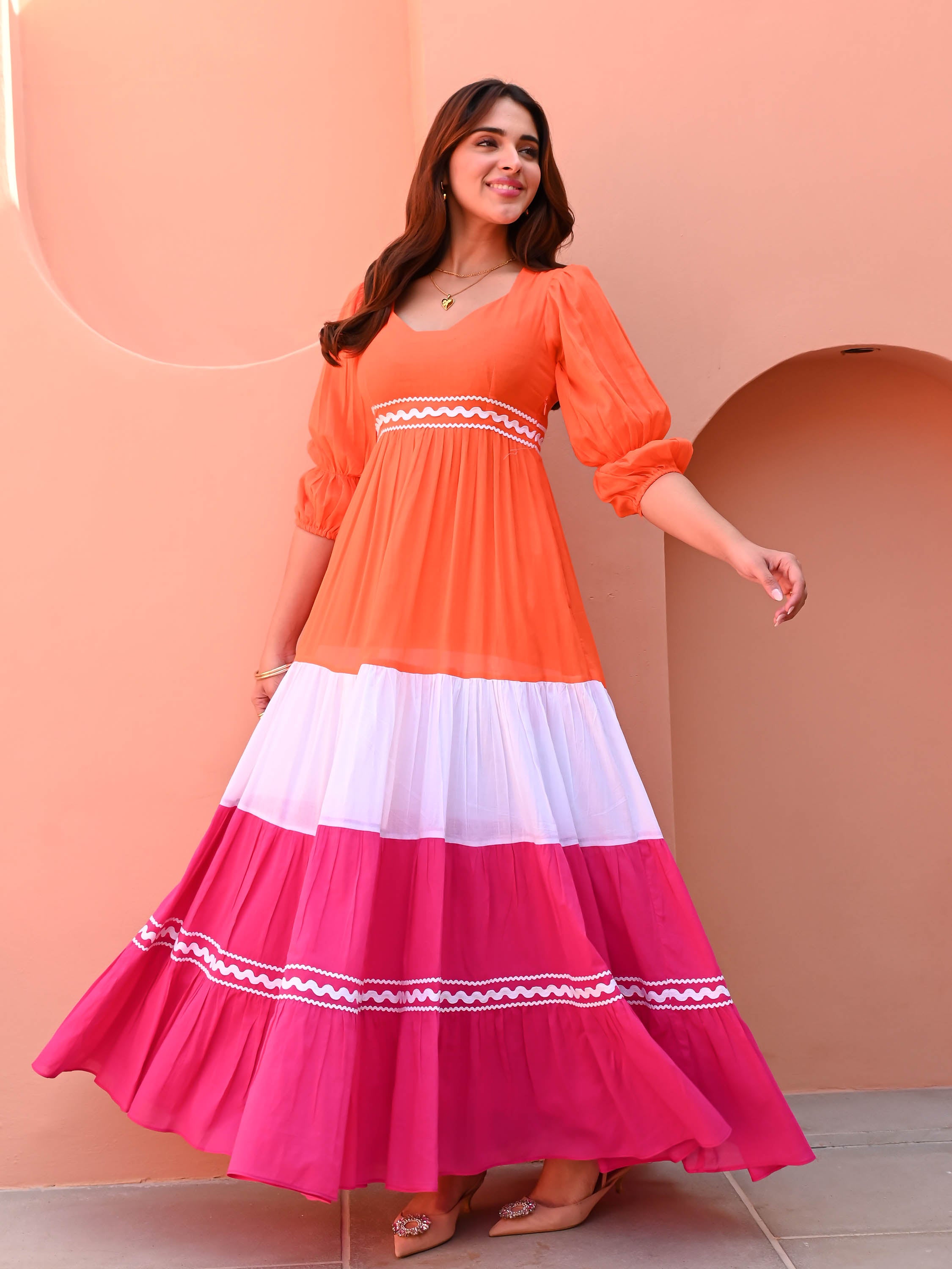 Embrace effortless elegance in the OWP Cotton Dress. Crafted from breathable cotton, this dress features a striking orange, white, and pink color-blocked design. Three-quarter puffed sleeves, a cinched waist, and a tiered full skirt create a flattering silhouette, while delicate lace detailing adds a touch of charm. Perfect for breezy days and stylish outings.