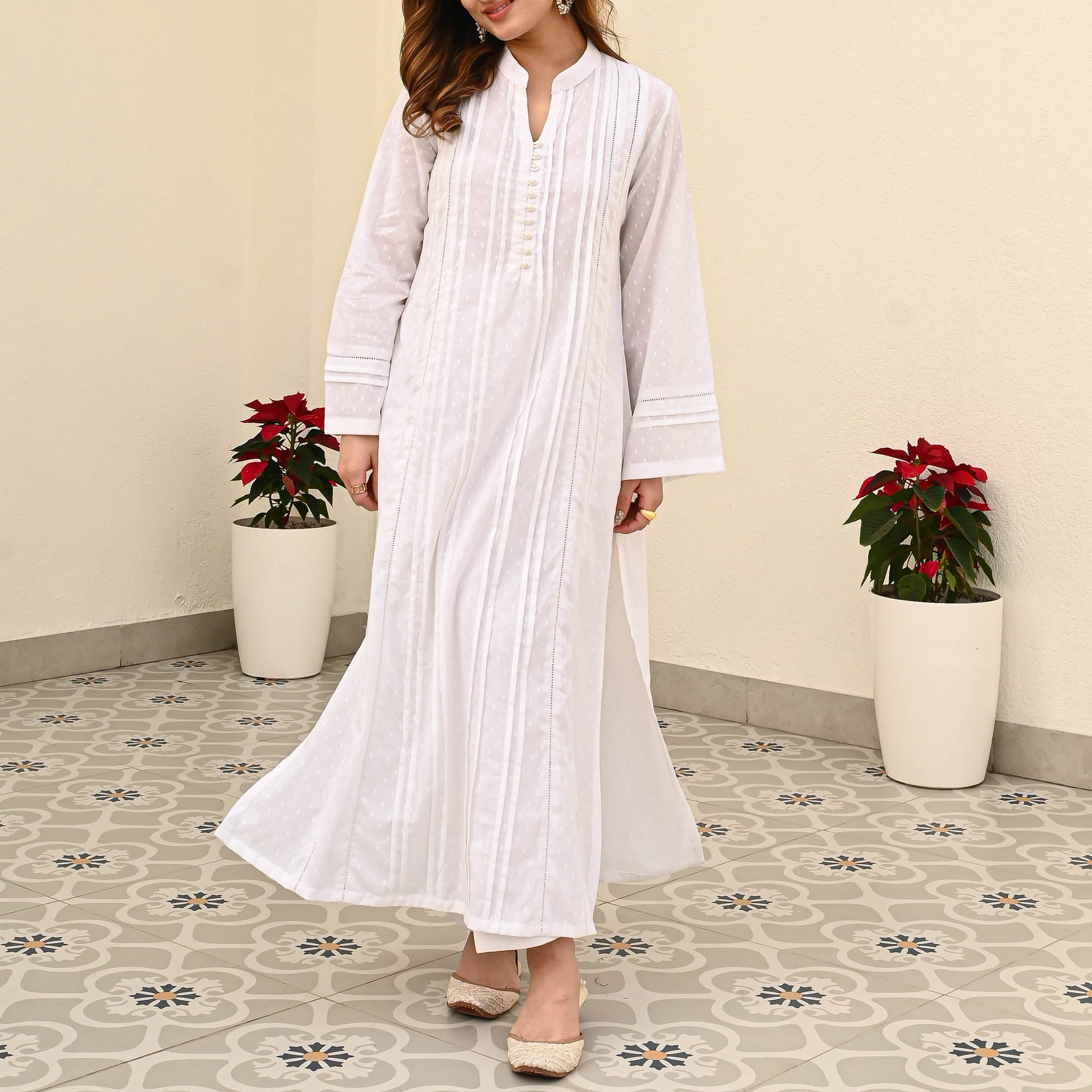 Strut into the summer in style with the stunning White Cotton Dobby Coord Set, crafted from the most luxurious and soft as-butter cotton dobby fabrics, the stunning co-ord set features a straight kurta with a mandarin collar and pearl with loop details on the front placket, pin-tuck details with ladder lace throughout, and full sleeves. Paired with matching pants to elevate the allure of the ensemble. The easy breezy relaxed-fit kurta is perfect for strolling through the sunlit summer gardens, feel comfy and chic without compromising on the style statement. Step out to slay this Spring-Summer and steal hearts.