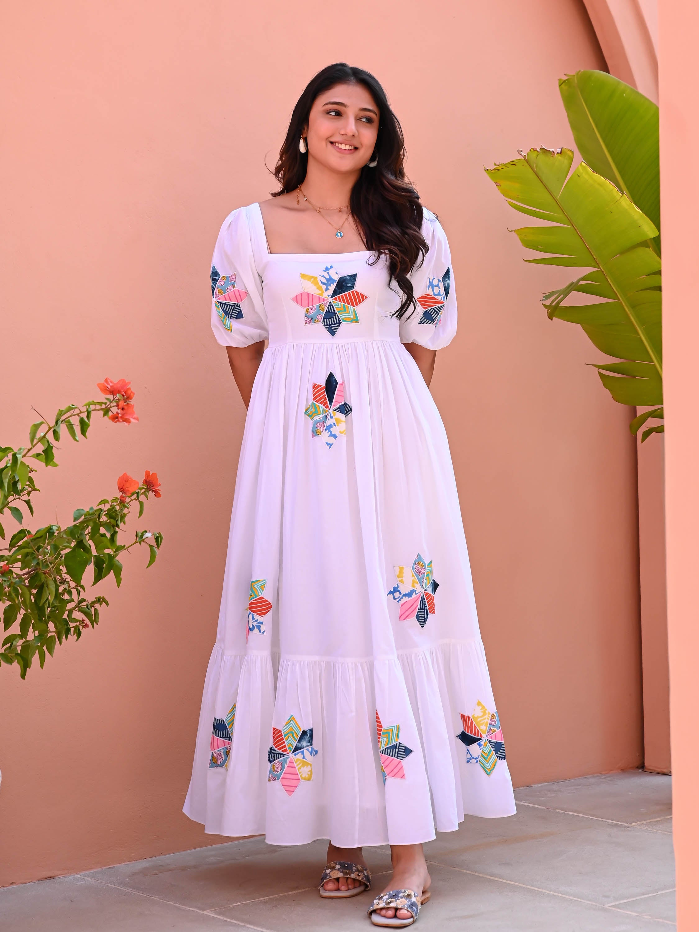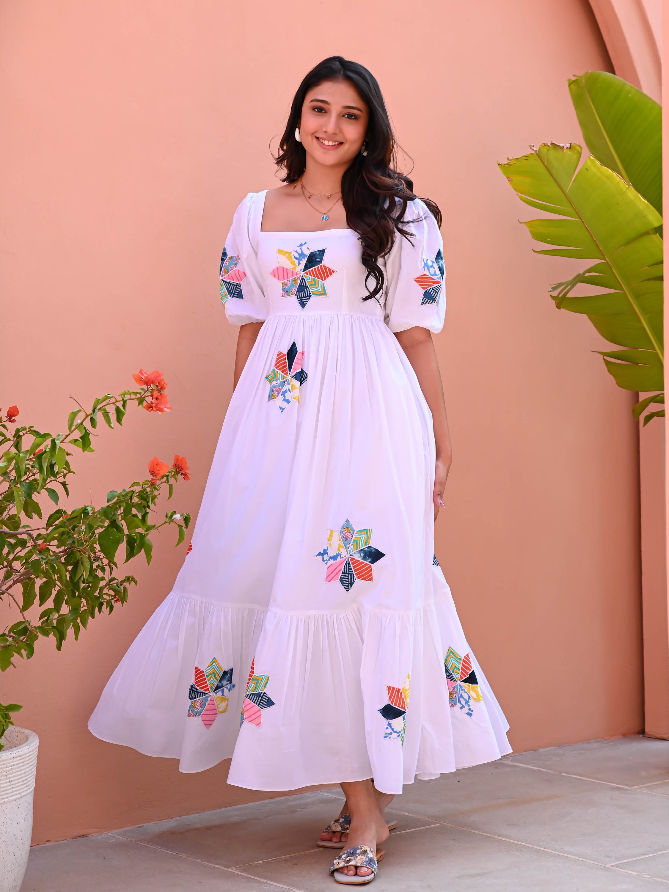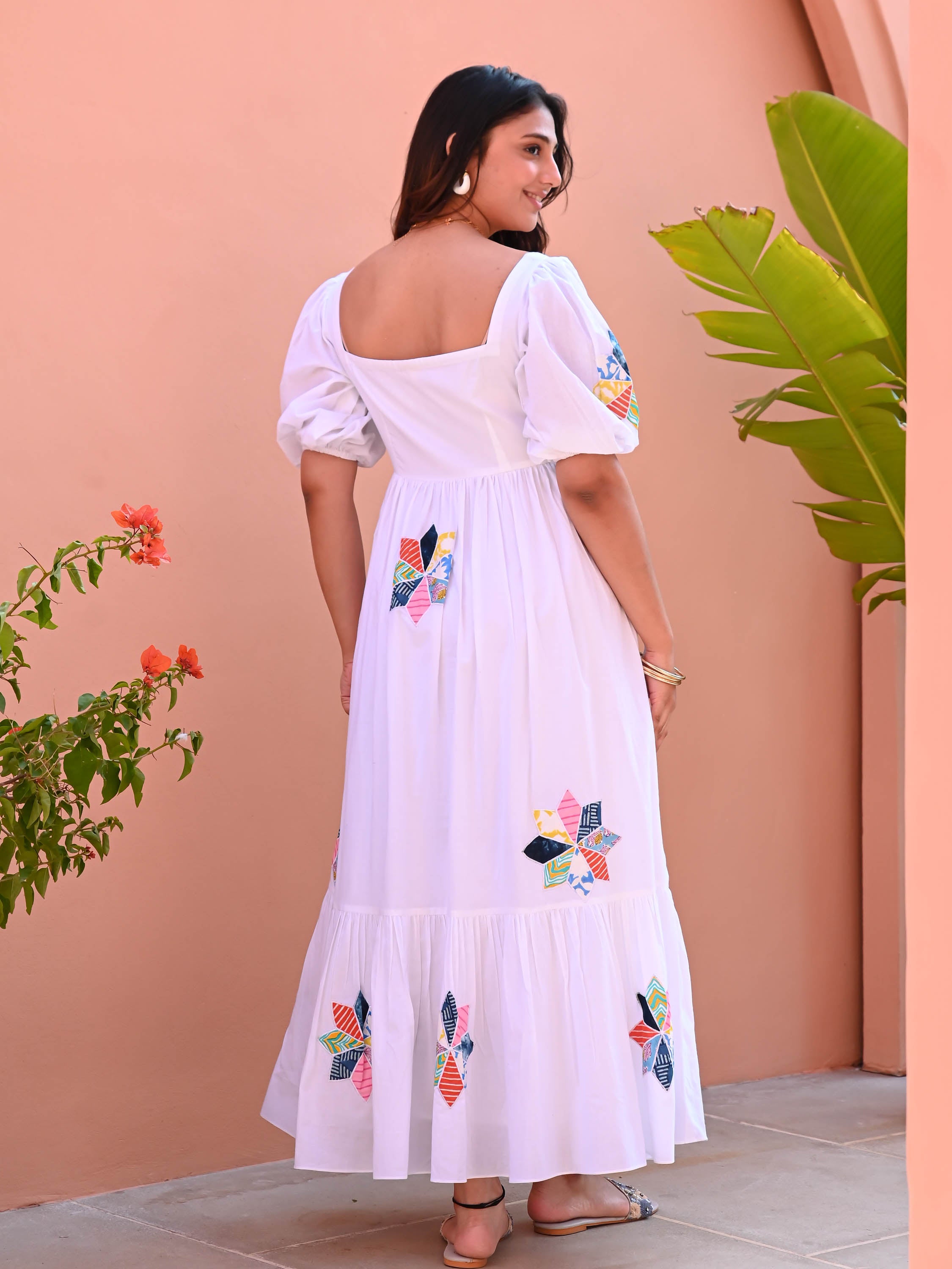 The White Flower Patchwork Cotton Dress is a timeless blend of charm and comfort. Crafted from white cotton, it features intricate patchwork detailing for a unique touch. A square neckline and short puffed sleeves add vintage elegance, while the tiered full skirt creates a breezy, flattering silhouette. Perfect for effortless daytime styling with a hint of nostalgia.